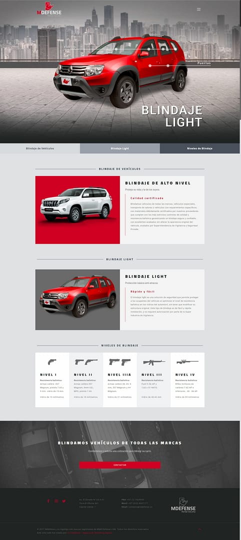 La solución fue más allá de un simple diseño; consistió en la construcción de un sitio web a medida que estructuraba la información de manera clara y persuasiva. Implementé composiciones visuales de alto impacto, combinando fotografías profesionales de sus vehículos blindados con diagramas técnicos del proceso de blindaje. Este último detalle fue clave para demostrar transparencia y profundo conocimiento técnico, educando al cliente potencial y reforzando la imagen de Mdefense como un líder técnico indiscutible.