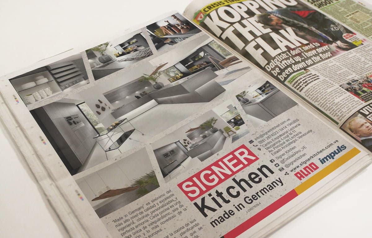 Respetando el logotipo y la marca de Signer Kitchen, procedí a diseñar una serie de piezas impresas que incorporaron estos elementos de manera armónica. Cada folleto, anuncio y catálogo fue meticulosamente compuesto para que la esencia de Signer Kitchen conviviera en perfecto equilibrio con el lenguaje visual premium de la marca alemana.